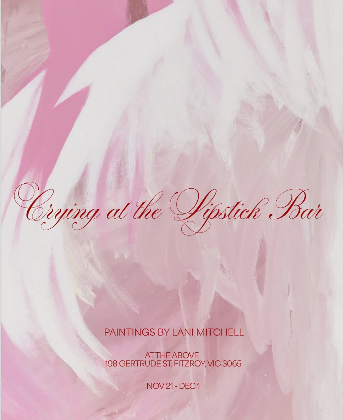 Lani Mitchell’s latest body of work, Crying at the Lipstick Bar, traverses the fault lines of longing, grief, and hope. This series of large-scale paintings conjures an alchemic landscape - fragmented, tender, and perpetually in motion. It is a dialogue between memory and desire, sorrow and future possibility. Mitchell fuses themes of idealism and the eternal pursuit of beauty with the raw earthiness of grief. Saturated reds and luminous pinks are set against muted creams and whites, the palette itself a meditation on absence and persistence. These works carry the spectral weight of personal loss: the death of Mitchell’s godfather David and close friend Julie. Their absence lingers in the air, yet their memory - vivid, intimate, unshakable - fuels the paintings’ emotional charge. The medium becomes the vessel. Thick oil paint, worked over days and months in the studio, absorbs the rhythm of mourning. Each brushstroke is both a mark and a memory, weaving past into present. Figures and landscapes hover in suspension, half-formed and elusive, caught between worlds: the living and the dead, the known and the unknowable. In this way, the paintings become not only images but thresholds. Loss here is not treated as void, but as gesture - a reaching toward love, beauty, and the persistence of spirit. Paris, once alive with romantic anticipation, emerges as a symbolic site of grief and revelation. Roses and lipstick kisses - tokens Mitchell and her loved ones once asked Julie to send as signs of her presence - appear throughout the work. Lipstick, a bouquet of roses,: the everyday made sacred through remembrance. Colour carries symbolic weight throughout the series. Red, embodied in lipstick but also in blood, becomes a marker of aliveness - an imprint that insists presence. White hovers as the counterpoint, asking the unanswerable: where does life, once vivid, go? Between them, pink emerges as play, a gesture of glamour and theatre, an insistence on lightness within heaviness. These tones are not literal but gestural, each mark a record of presence, of memory pressed into paint. The palette itself becomes ritual: a dance between vitality, absence, and the traces left behind.